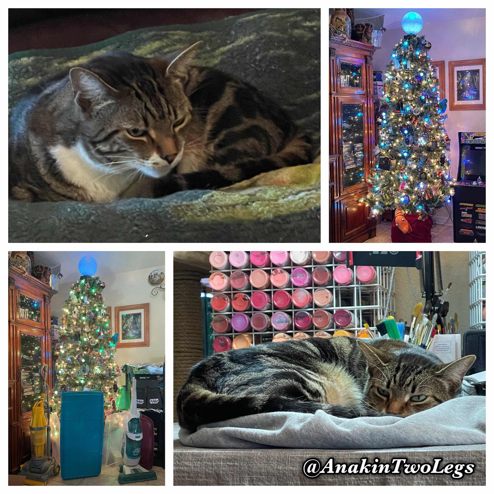 🎄 My Tree! (Pics before & after) It is coated in bitter spray to keep the cats from biting on it. In the past they would nibble on it a little bit, but not much. For some reason this year, Quincy just went nuts, wanting to eat the tree. They don’t seem to be bothered by the bitter spray at all. So as you can see from the pics, we have now put up a barrier around the tree and tried to block off the cats getting to it at all. Arya was trying to nibble the tree too. So far it seems to be working if I decide it is not I’m just going to take the tree down early this year and figure out something new for next year. I do have a camera so I can go back and see during the night if they try to mess with it or not.