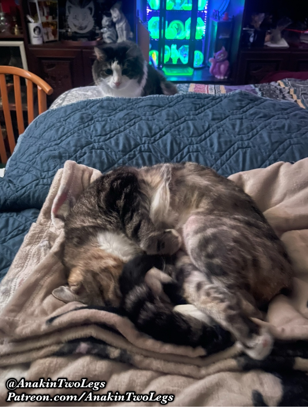 Romeo is much better than he was but still not 100% yet. He has Bartonella aka cat scratch fever. We think he got it from an infected flea possibly from one of the stray cats that goes through our backyard. Then the flea came on the screen porch and bit him so we’re planning on spraying the yard for fleas. or its possible that he has had that in his system since he was a kitten and for some reason, it’s just now showing itself. Also they said humid climates up to 40% of cats are carriers of Bartonella and usually don’t show any symptoms. Or it’s possible that he might not even be sick from that and just have some kind of upper respiratory infection. They really aren’t sure. It!s kind of weird. They said we didn’t need to put him on antibiotics since he doesn’t have a fever anymore. So we’ve just been treating his other symptoms and it can take a few weeks for him to get all better. Above is a pic of Anakin watching Romeo sleeping on a comfy blanket on my bed 🥰 Thank you again for all of the well wishes for Romeo ❤️