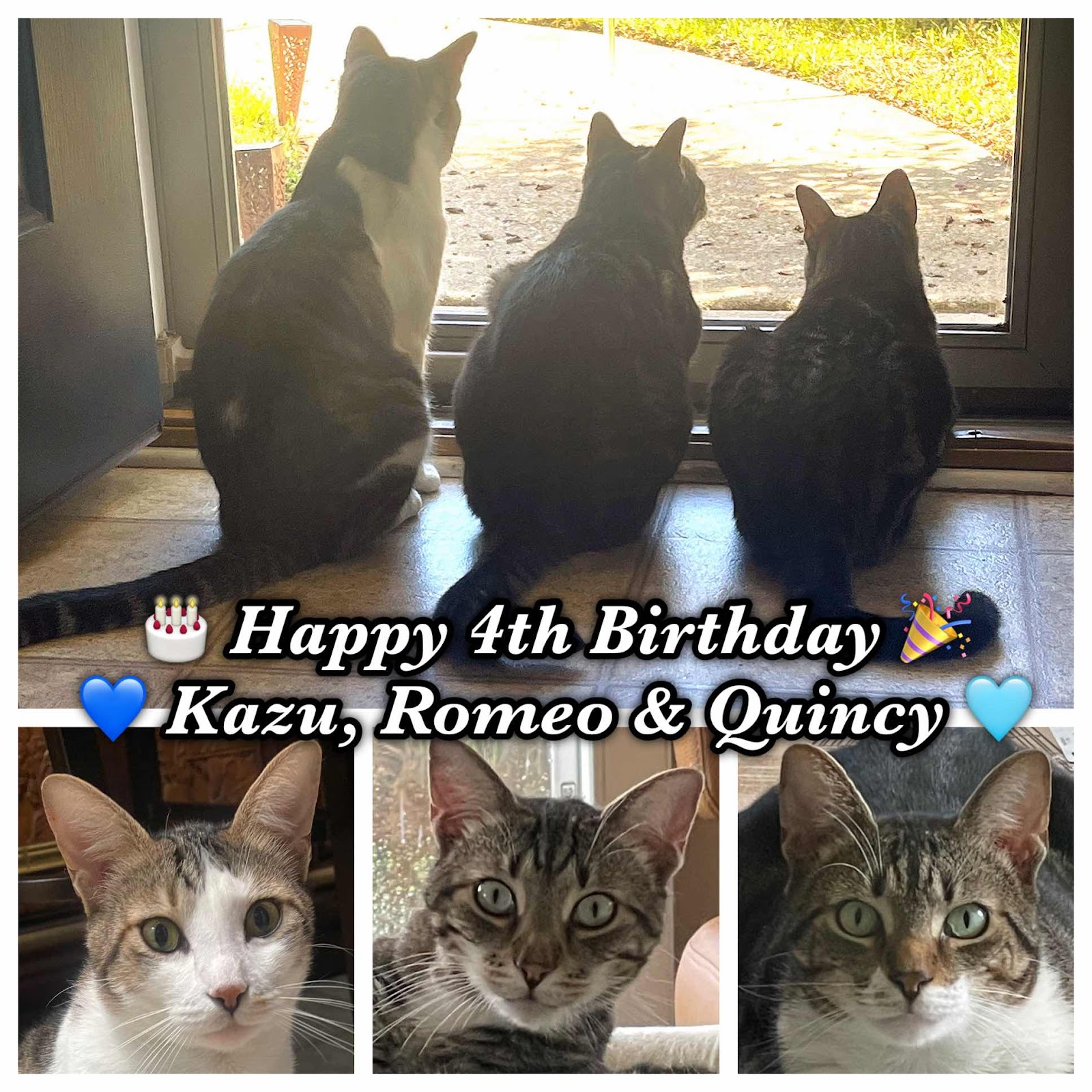 Please Help Me Wish a Happy 4th Birthday to My Boys! Kazu, Romeo & Quincy!! ππππΊπΎ❤️ Wishing the most wonderful birthday ever to my sweet baby boys & many more! & to their feral mom Mama Moo Moo that I still feed and take care of . Kazu is spending his birthday still hospitalized at the Emergency Vet for an infection and Diabetic Ketoacidosis. I do not have a morning update yet. They are waiting on some lab work. I will make an update after I hear from them. I will also let them know it’s his birthday today since I can’t see him So they can give him extra cuddles. π Also thinking of Forrest at the Rainbow Bridge today on what would have been his 4th Birthday too πWe all love you boys so much! Xoxox!! πππ