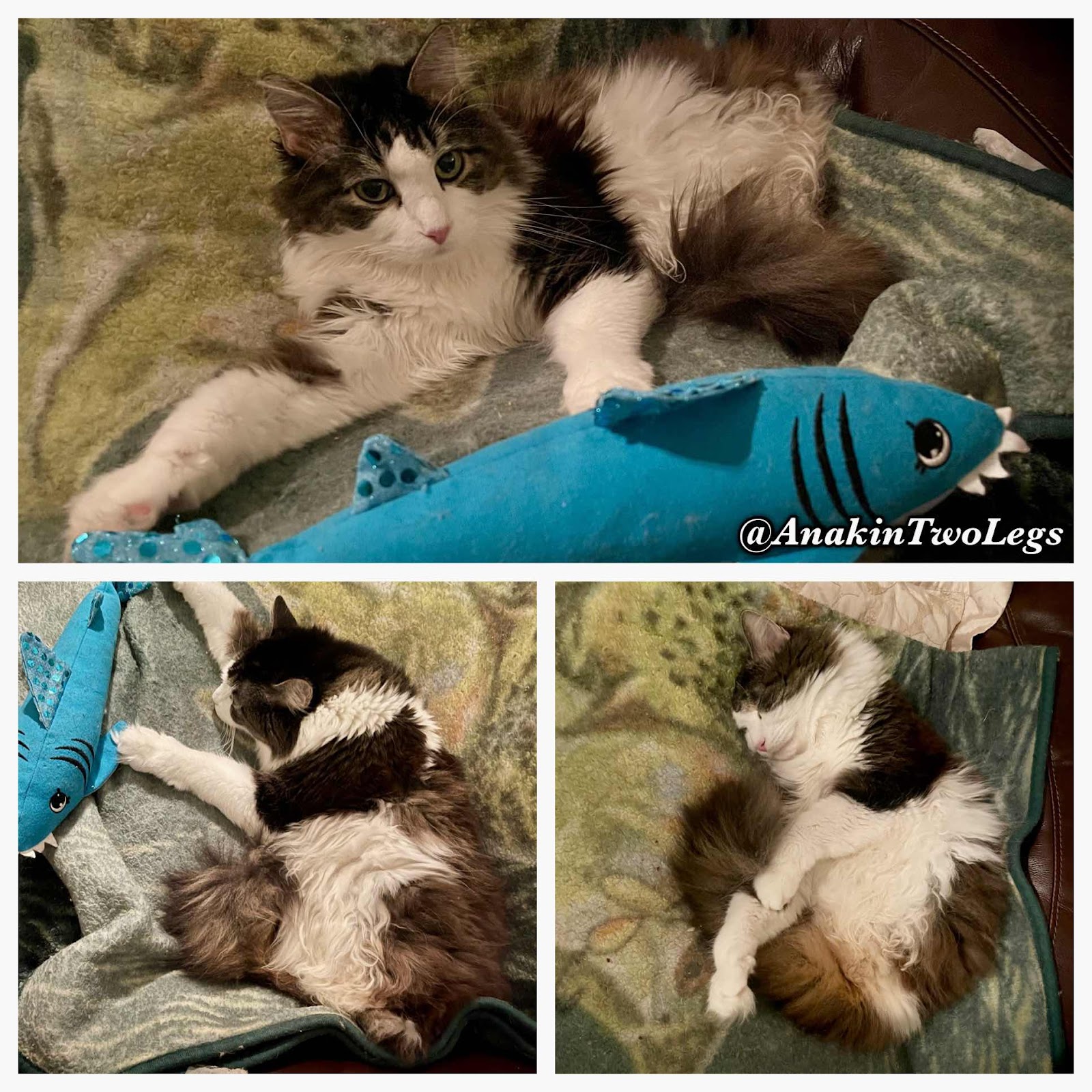 Anakin doing what he loves! Napping all day 😻💙 This is Ani’s current favorite sleeping spot on the couch in the living room. Pixie gets her staples out tomorrow & Mika is doing so much better too.